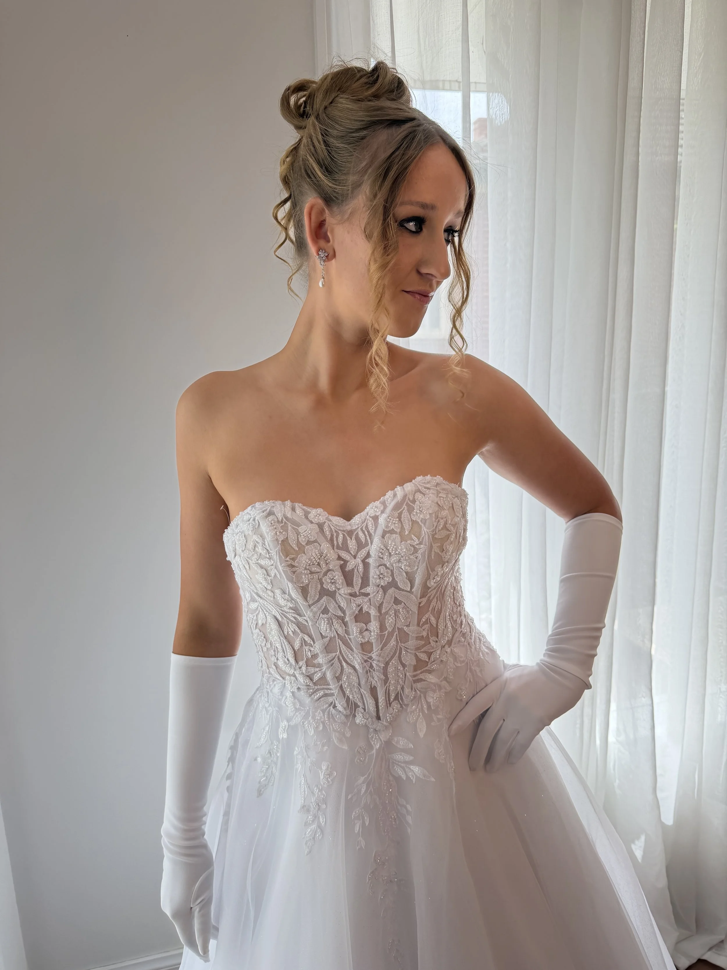 Eden blends modern structure with delicate detailing. The sheer bodice reveals exposed boning, creating a sculpted, corseted effect that feels refined and elegant. A soft sweetheart neckline frames the décolletage, while the V-shaped waist cinches and elongates the silhouette, drawing the eye downward. From there, a weightless tulle skirt floats out in airy layers, catching the light with every movement. Eden captures an unmistakably modern debutante look with a timeless, dreamlike finish.