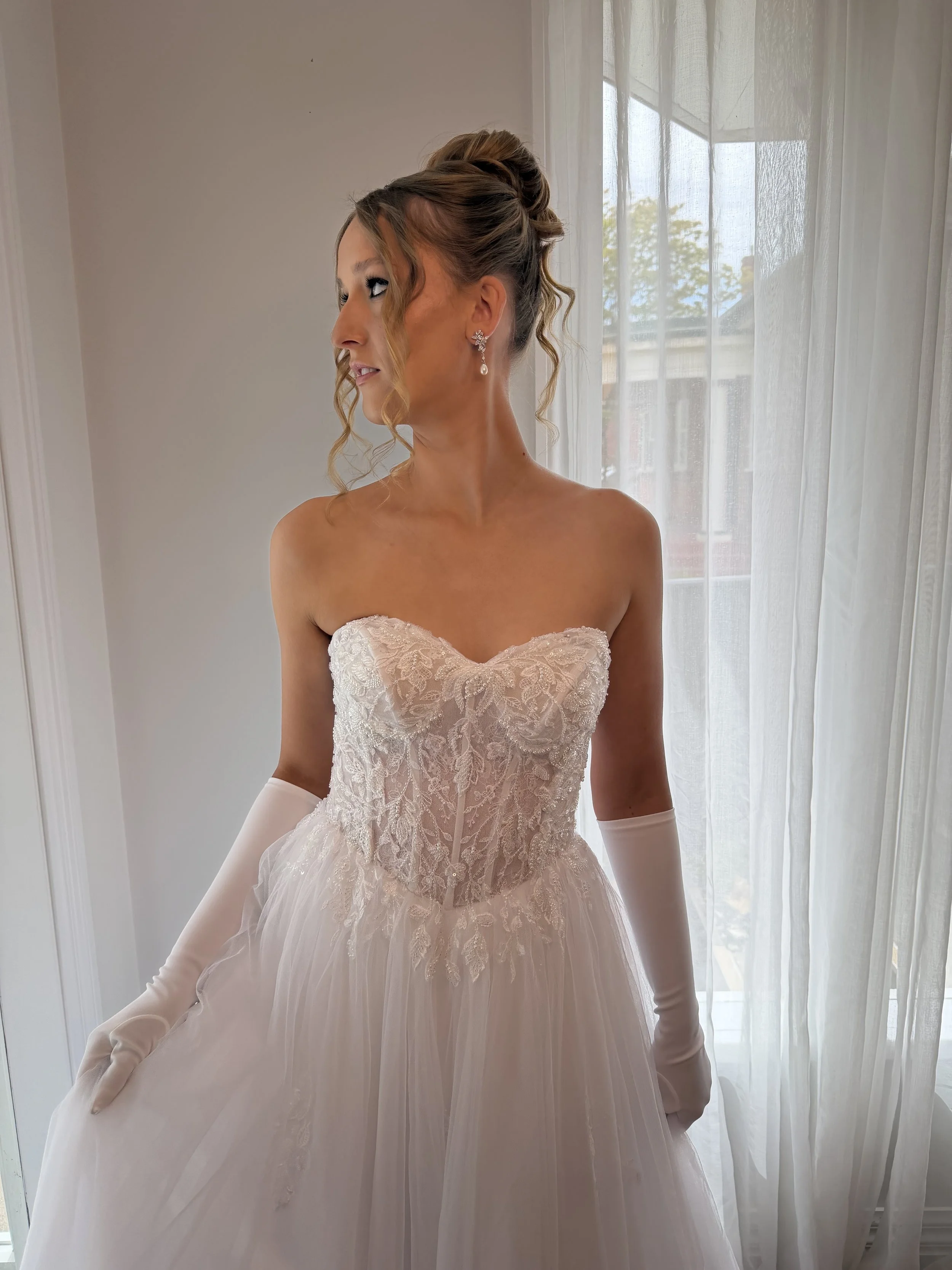 Raine is the definition of fresh, modern elegance. Featuring a soft sweetheart neckline, the sheer bodice creates a light, flattering silhouette. Detailed motifs are scattered across the flowing tulle skirt, adding texture and a soft shimmer with every step. Designed to stand out, Raine brings a confident, unforgettable presence to your special night.